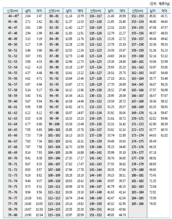 1. 성별, 연령, 신장을 기준으로 표준체중을 구합니다.