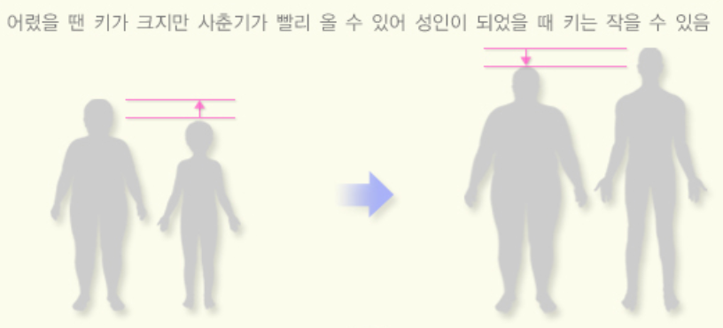 ● 여아의 경우, 비만이면 성장호르몬이 지방을 분해하는 데 쓰여 성장판이 충분히 자라지 못할 수 있습니다. 따라서 여아 비만은 키 성장에 부정적인 영향을 미칠 수 있습니다. 또한, 여아 비만은 월경을 일찍 시작하게 할 수 있습니다. 월경이 일찍 시작하면 키와 골격이 충분히 자라지 못한 상태에서 성장이 완료될 수 있어, 최종 키가 작아지고 팔다리가 짧아 비율이 나빠질 수 있습니다.