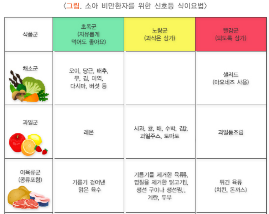 소아는 계속 성장을 하고 있는 시기에 있으므로 성장을 위한 충분한 영양 공급이 필요합니다. 따라서 식이요법은 소아의 성장과 발달에 필요한 영양소를 충분히 섭취하면서, 과잉 섭취하고 있는 잘못된 식습관을 고치도록 하는 것입니다.