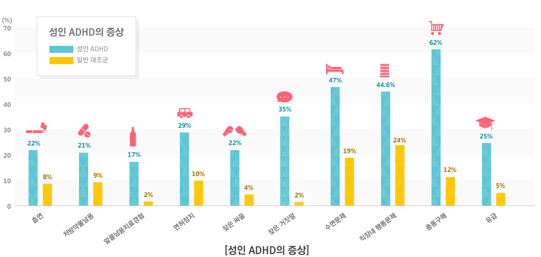 우울, 공황, 알코올중독, 업무를 하는데 집중력이 문제가 있고, 잦은 업무실수 등의 문제로 정신건강의학과를 찾았다가 ADHA로 진단받는 경우가 흔합니다. 항상 바쁘고 내적으로 초조하고 해야 할 일에 집중하기 어렵고 자꾸 실수하거나, 성급하고 걸핏하면 화내고 충동적으로 물건을 사며, 하나에 빠지면 중독증상으로 잘 헤어나기 어려운 특성이 있는 경우는 성인 ADHD를 의심해봐야 할 것입니다.